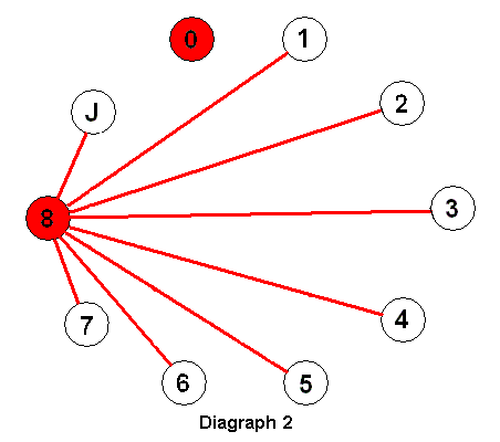 Firstly we need to determine the entire list of answers given to Jocelyn. This is simple. The maximum number of people a person could shake hands with is 8. Remember there are 10 people who can shake hands and you do not shake with yourself or your partner, so you are left with 8. If Jocelyn asks 9 people then the nine different answers must be {0, 1, 2, 3, 4, 5, 6, 7, 8}. (1 is of course the person who shook only one hand, 2 is the person who shook two hands etc etc). The ten people can then be represented by using a graph with {J, 0, 1, 2, 3, 4, 5, 6, 7, 8} the set of nodes, where J is Jocelyn (Graph 1) .
